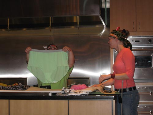 The underpants were an inside joke from the opening ceremonies. One of the teachers shared with us that her 3-year-old granddaughter had gone into the bathroom with her at a store and made a comment about how HUGE her underwear were. So underwear got to be the unofficial theme of the event. The ones Robbi Joy is holding in the photo above got snipped and made into a faux tossed salad during the competition.